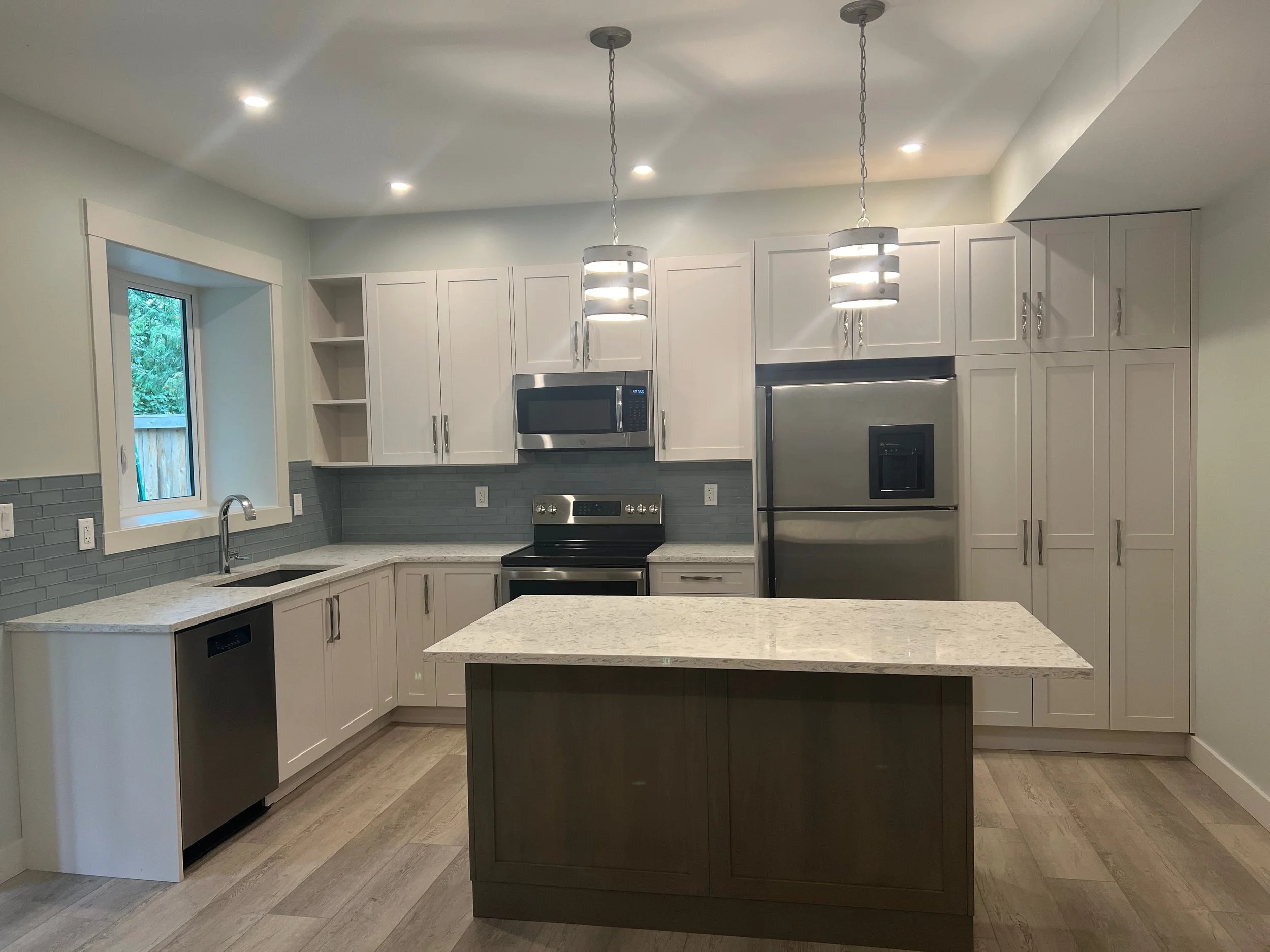 For added value, enjoy a legally recognized one-bedroom suite with its own den, bathroom, and spacious open concept living area. The suite's kitchen features four appliances, a large island with quartz counters, plus plenty of cupboard and pantry space. This unit offers lots of storage, in-suite laundry, separate heat pump for heating and cooling, and a covered patio offering a peaceful retreat surrounded by greenery. This makes for an ideal space for guests or potential rental income.